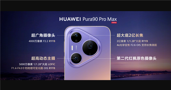 至于 Pura 90 Pro Max,就是直接拉满了,主摄用上了动态范围更强的 1/1.28 英寸 LOFIC 传感器,同样支持十档可变光圈、安排上了第二代红枫原色摄像头。