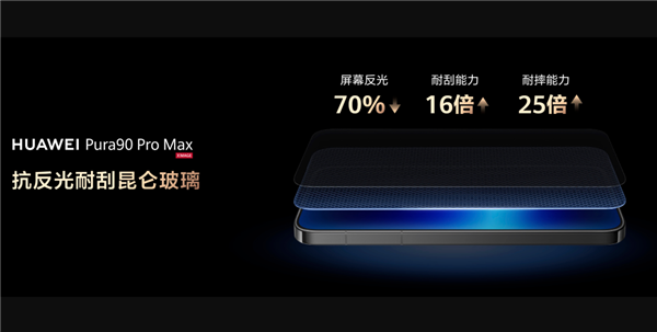 另外,Pura 90 Pro Max 还独占抗反光耐刮昆仑玻璃,屏幕反光下降 70%,耐刮能力提升 16 倍,耐摔能力提升 25 倍,户外看屏幕更清晰,日常用也更抗造。