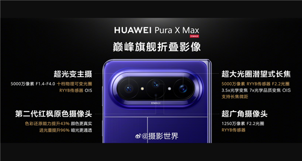 如果说 Pura 90 系列是在传统形态里卷影像,那 Pura X Max 就是华子直接掀桌 —— 它没有走传统大折叠的路子,而是在 Pura X 的基础上,整了个 “ 大阔折 ”。