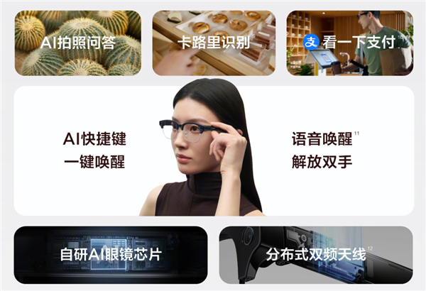 这玩意整机重量只有 35.5 克,镜腿薄至 6.25 毫米,还塞了颗 1200 万像素摄像头,支持 0.7 秒 AI 闪拍和 AI 构图矫正,以及支付宝扫码支付,2499 元起售。