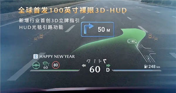 同时,新车还首发了100英寸裸眼3D HUD,利用双目成像原理实现眼球随动,3D导航可将道路虚拟标志以立体形式投射在视野中,导航精度和沉浸感远超传统AR-HUD。