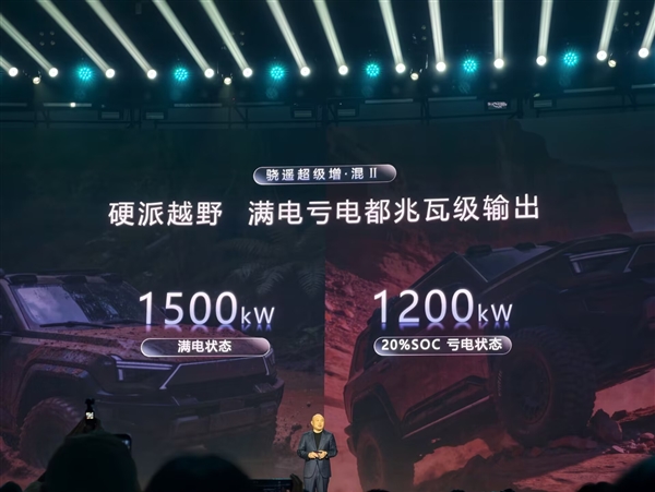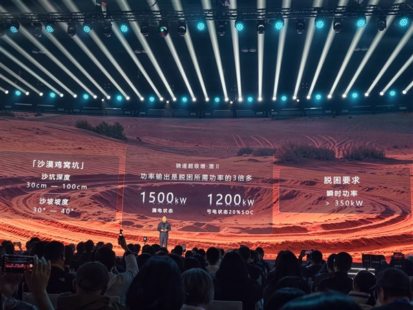 以硬派越野中被称为“沙漠绞肉机”的鸡窝坑场景为例,脱困需要超过350千瓦的瞬时功率,而骁遥二代亏电1.2兆瓦的输出能力是脱困所需的三倍之多,即使电量只剩20%甚至不到10%,仍能一脚电门轻松脱困。