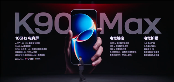 屏幕方面,K90 Max配备一块6.83英寸的大屏,采用M10发光技术体系打造,拥有3500nits超高亮度,支持480Hz多指触控报点率+3500Hz瞬时采样率。支持HDR10+与青山护眼3.0技术,强光可视与长时间护眼兼顾。
