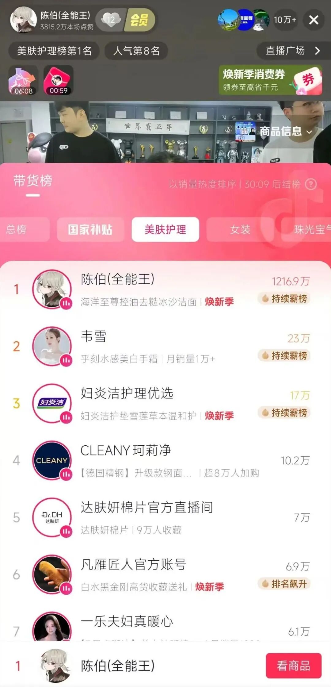 作为 QQ 飞车职业选手出身,世界赛亚军、全国冠军一堆,陈伯靠技术打底、节目效果拉满,成功从纯游戏主播,进化成游戏 + 带货双栖顶流。